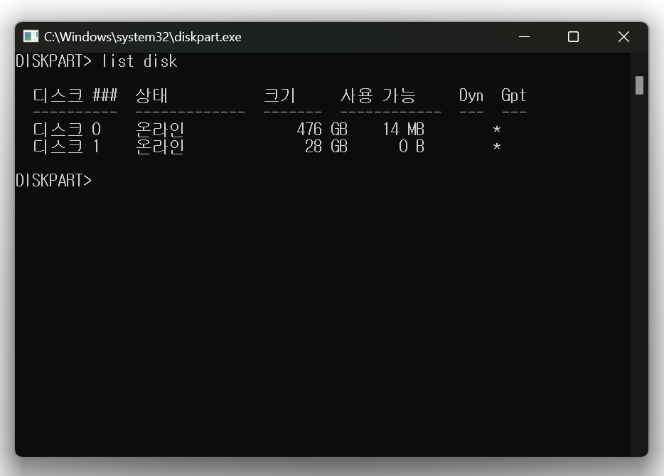 'list disk' 명령으로 컴퓨터와 연결된 디스크 확인.