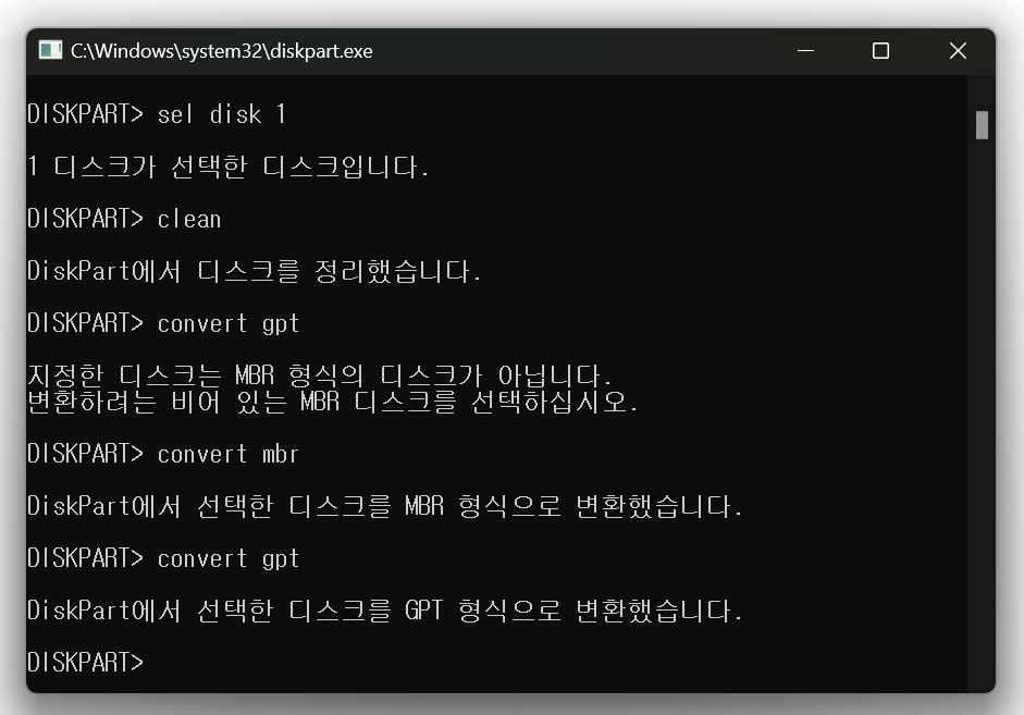 'convert mbr/gpt' (mbr, gpt 둘중 하나 선택) 명령으로 형식 설정. 이미 동일한 형식으로 설정되어있다면 아래와 같은 문구가 나타난다.