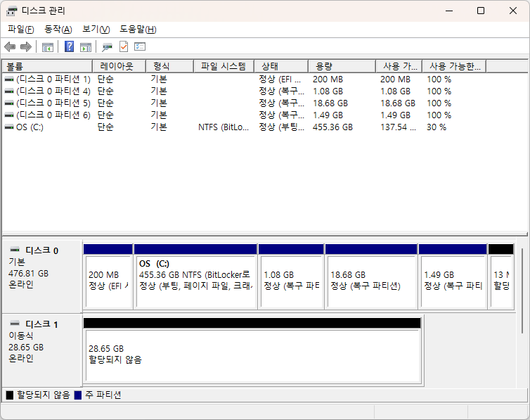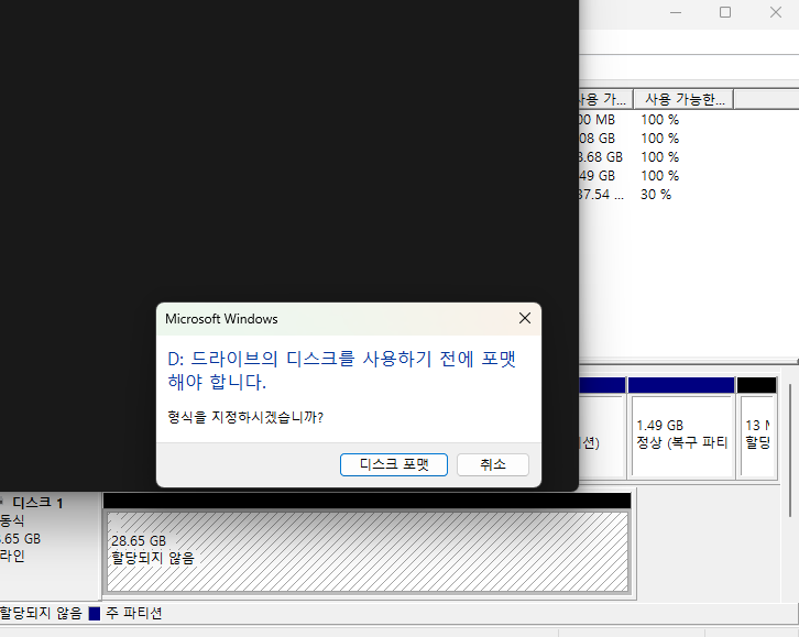 MBR/GPT 설정이 완료되었다면 디스크 관리를 실행하여 파티션을 설정해준다.