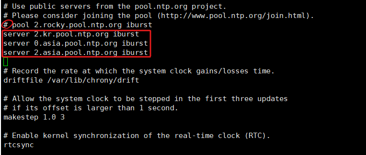 해당 부분('pool 2.rocky.pool.ntp.org iburst')을 주석처리(#) 해주고 설정하고자 하는 서버를 등록한다.