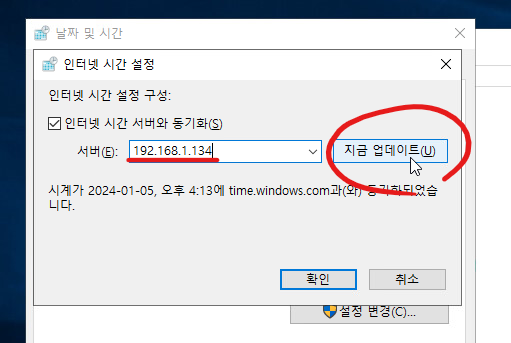 저 부분에 동기화할 NTP서버(192.168.1.134)를 입력한 후 '지금 업데이트'를 클릭한다.