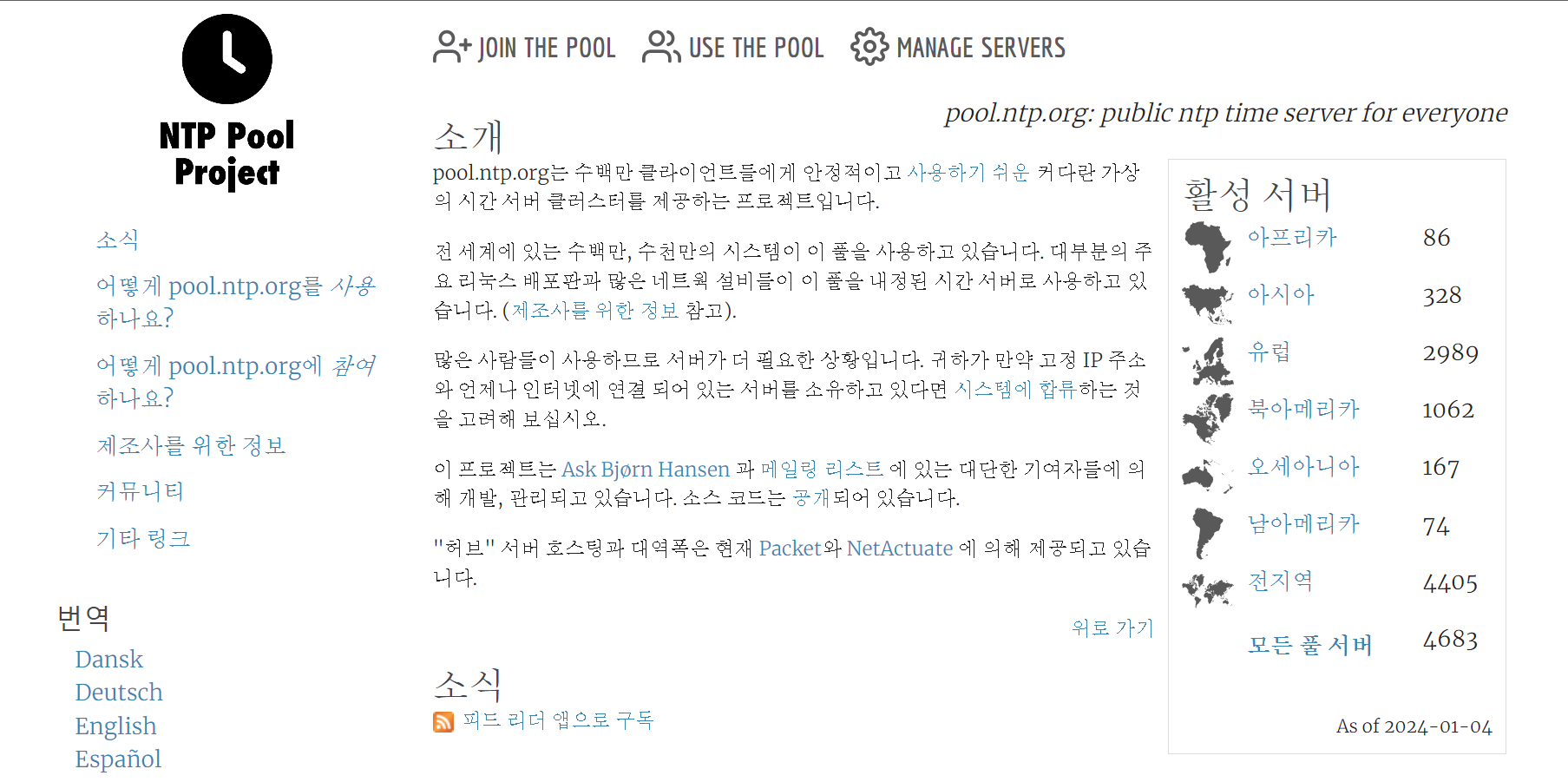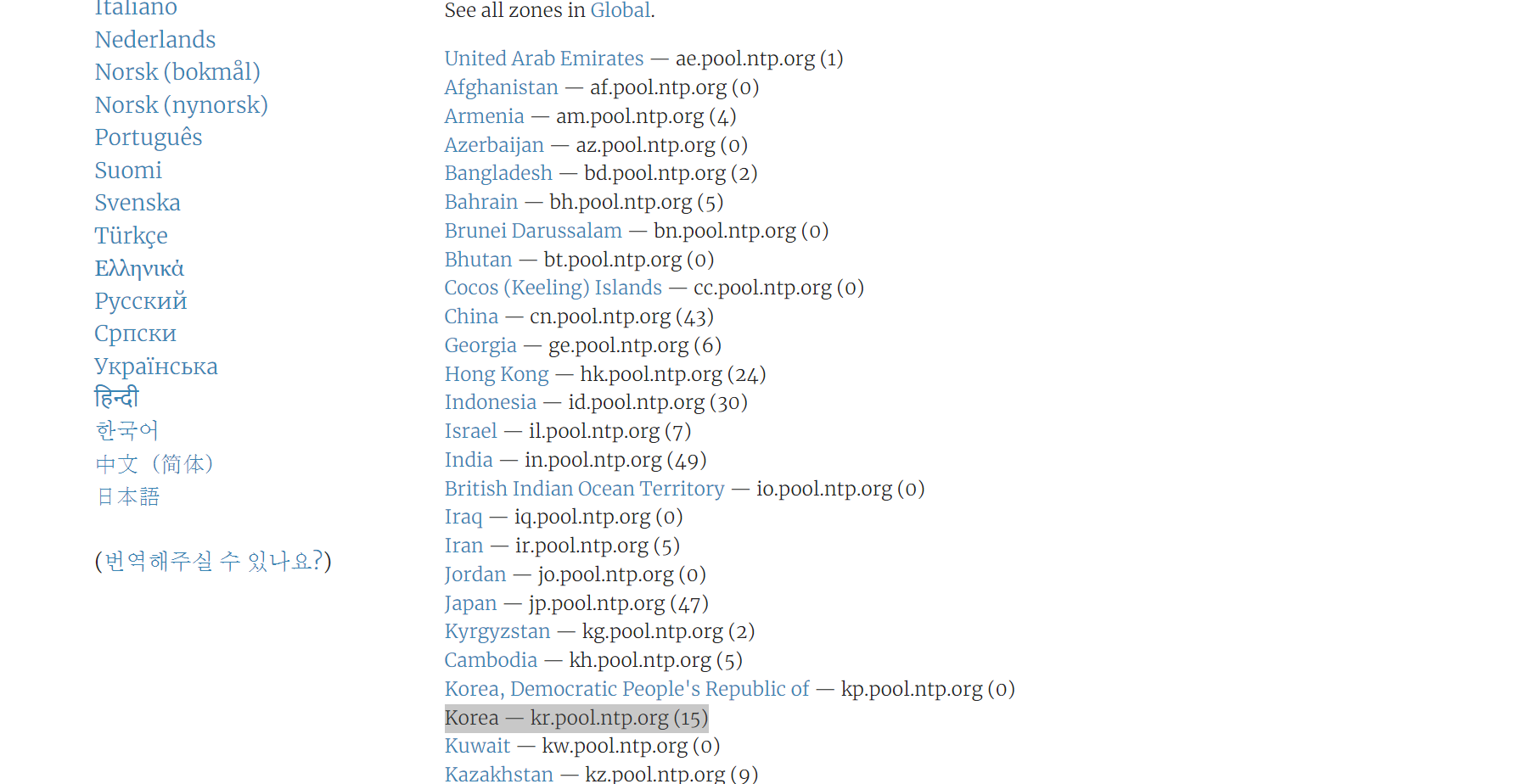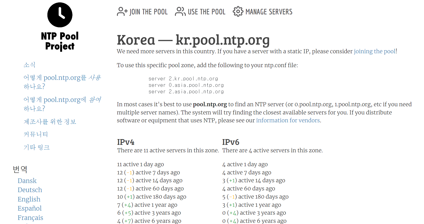 외부망에서 레퍼런스를 찾는다면 https://www.ntppool.org/에서 지역별 NTP서버 확인이 가능하다.
