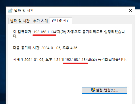 위의 리눅스 NTP 서버로 생성한 '192.168.1.134'를 사용할 것이다.