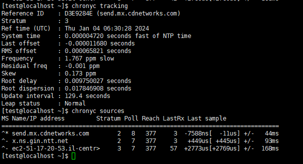 'chronyc sources'와 'chronyc tracking'을 통해 NTP 레퍼런스가 잘 등록되었는지, 동기화는 잘 되는지 확인할 수 있다.