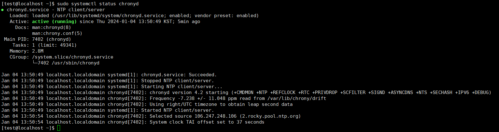 chrony 패키지를 설치 후 chrony데몬을 실행하여 정상적으로 chrony가 동작하는지 확인한다.