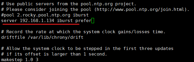 디폴트로 설정되어있는 NTP서버를 지우고(혹은 주석처리하고) 생성한 내부망의 NTP서버의 IP(192.168.1.134)를 사용하여 레퍼런스로 삼는다.