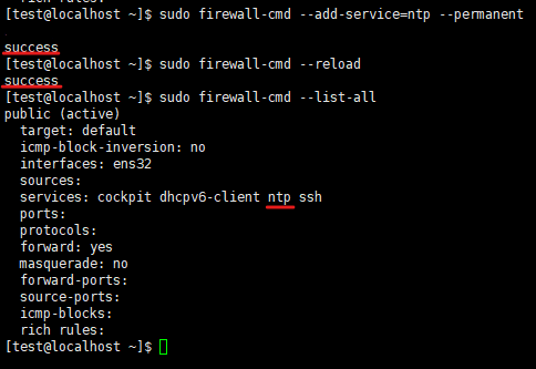 # sudo firewall-cmd --permanent --add-rich-rule="rule family='ipv4' source address='192.168.1.0/24' service='ntp' accept"